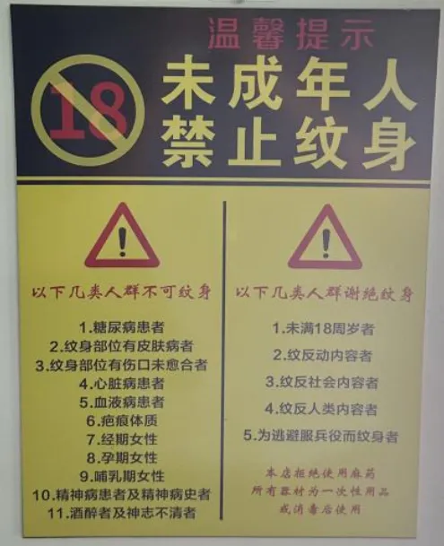 广大文身行状提供者要严格效能相干法律规定,要在店内显赫位置明确标示不向未成年东谈主提供文身行状的晓谕;在遭受难以判断顾主是否成年的情况下,应当主动条件其出示身份证件,以确保行状对象的正当性,共同顾惜未成年东谈主的身心健康和正当职权。